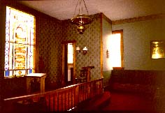 The chancel has modern red carpeting, but the original stenciling on the walls and cornice paper is still present. The chancel walls are painted a light grayish-green and stenciled with a gold fleur-de-lis design. The cornice paper retains the same design from the sanctuary, but the background is colored a dark green, which further separates the chancel from the sanctuary and accentuates the sense of depth. The church interior was updated with Queen Anne style details in the last two decades of the nineteenth century.