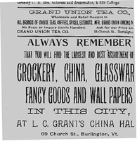 This structure was built in two sections, but is now one building. It has cast iron lintels and the cornice is bracketed and has dentils. Today the storefront of #71 is almost entirely intact. Construction of the building began in 1860 and was completed in 1863. The Union Block (#57-59) was constructed by Edward Loomis & A.W. Allen. Half of the ground floor was used for their leather and saddle business. The Central Block (#61-75) also may have been built by Loomis and Allen, and has housed numerous businesses over the years. (1) #61 Church Street housed a drug store for many years and #73 was the photographic studio of L.G. Burnham. Burnham's studio was also a jewelry store, and an art store that sold etchings and engravings. The 1890 map of Burlington by C.M. Hopkins, CE shows that #69 Church Street was owned by the Johnson Brothers. The Johnsons owned China Hall, a shop that sold fancy goods and wallpaper. The Johnson Brothers owned China Hall until about 1895 when L.C. Grant became the proprietor. The following are advertisements from some of these businesses: