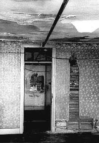 Left: Former student dormitory room, Old Mill attic, north wing, looking east. Note the transom window above the door and the flue hole for a stove pipe. (Photo: T. Visser, 1988.)