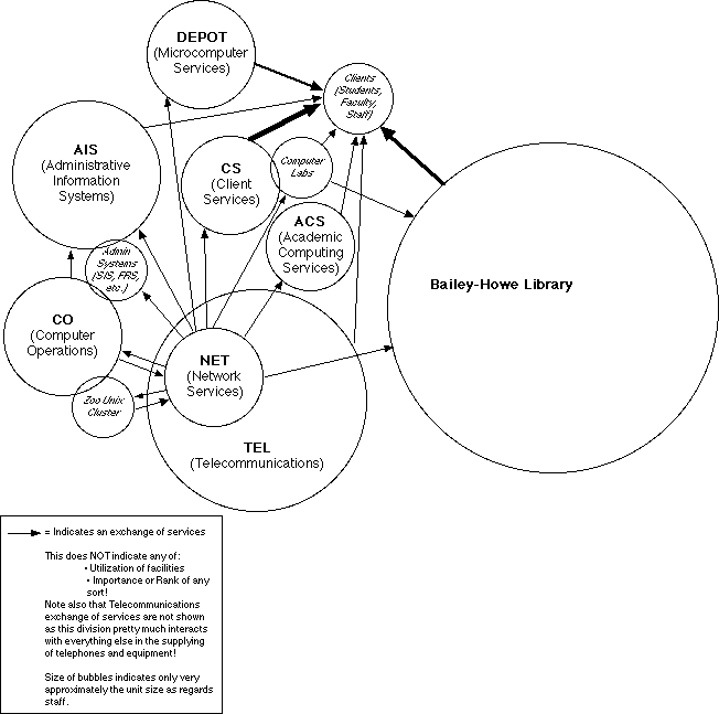 The interaction between the units in CIT is more complex than can reasonably be shown on this sort of diagram. Consider, for instance, the use of the network. Everyone who uses a computer is likely to use the network, and since the network is maintained by Netwrok Services, there should be an arrow linking everything to the Network Services Bubble. Similarly, a very large number of UVM people make use of the Zoo Unix cluster, and again, there should be an arrow depicting this relationship.