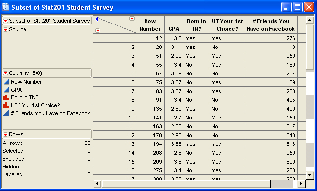 Notice that this table has 931 rows. We are going to select a simple random sample of size fifty from this large data set.