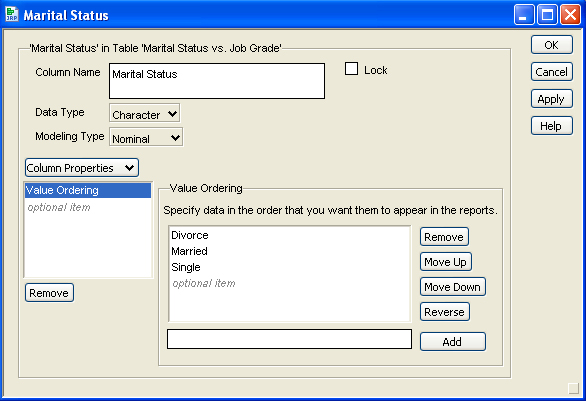Notice the names within the Value Ordering box (Divorce, Married, Single) are in alphabetical order. Click on a name and then click Move Up or Move Down until you have them in the order you want them presented. For example: