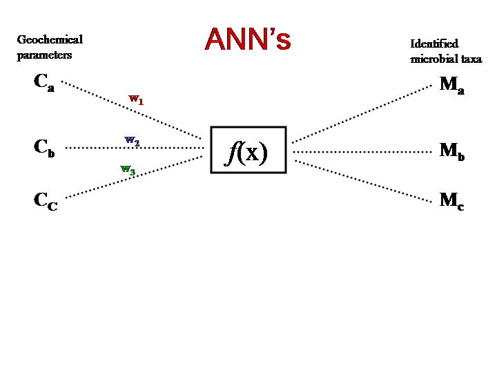 Dr. Donna Rizzo, at UVM's Civil and Environmental Engineering Department, is an expert in the design and application of Artificial Neural Networks, a modeling technique that seeks to identify patterns of change and provides weighting to the factors which most strongly affect changes between datasets (see schematic figure below). This thinking is of great potential in addressing the relationship between geochmical environments and microbial ecology because we will have a method to quantitatively assess the degree to which organisms respond to perturbations in their environment and how single or communities of microorganisms change and maintain theor own geochemical environments while maintaining the redox gradients necessary for metabolic function.