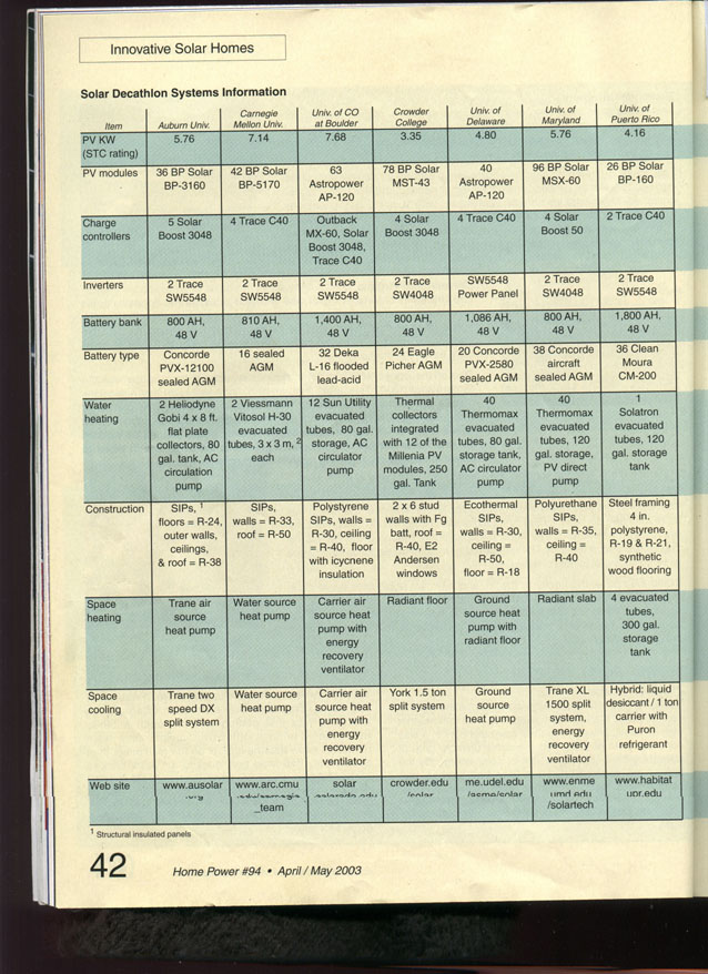 Solar Decathlon (College solar contest) article from Home Power-Solar Decathlon specs1