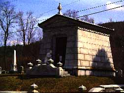 Laurel Glen Mausoleum, completed in 1881, is in the front center section of Laurel Glen Cemetery, northwest of Laurel Hall on the opposite side of the road. The rectangular, pediment-front mausoleum is constructed entirely of smooth faced granite. The battered walls are laid in coursed ashlar above a watertable. Below the watertable the walls are vertical. The main corners of the walls and the corners of the entranceway are chamfered and carved into the shape of laurel leaves. The name Bowman is carved in the front pediment. A frieze with triglyphs and metopes runs under the eaves line on each side. The metopes contain festoons of laurel leaves. Finials rise from the roof ridge at front and rear. The date "1880" is carved on the outside wall above the entranceway. A double transverse flight of stairs faced with a buttress rises to the entrance. This buttress is topped by four urns. "Laurel Glen Mausoleum" and two laurel branches are carved on its front. On the first step on either side was a copper bootscraper with an incised floral pattern. The one on the southwest has been broken off. At the top of the steps is a large-scale marble statue of John P. Bowman ascending the steps to the mausoleum door. The figure holds in its hands a top hat, cloak, gloves, key, and funeral wreath. An elaborately patterned bronze summer door with a chain mesh screen covers the entrance. Inside this is the main door, a solid, undecorated slab of granite.