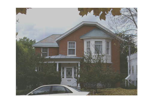 This brick house is thought to date from the 1860's. The 1869 Beers Atlas labels this as the home of A. Parady. According to a descendant, "A. Parady" was Angele (or Angeline) Paradis, the widow of Charles Paradis, who had come to Burlington in 1816 to build what is now the Unitarian church. Angeline's son Edward (Alfred Edouard) and his wife Marguerite Massé also lived at 429 South Willard Street. (1) The Historic Sites & Structures Survey states that this was the home of Edward Parady, who in addition to being a carpenter was employed by local quarry owner Guy Willard. Beginning in 1903 Ernest E. Smith is listed as residing at 429. Smith was a bookkeeper at the Baldwin Refrigeration Co. in 1900. In 1910 Smith had been promoted to assistant manager, and by 1930 was president of the company. He continued to occupy the house until the mid-1960's. The house was remodeled in the Colonial Revival style when Smith bought the house in 1903. (2)