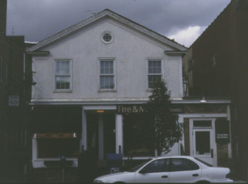 According to the Burlington Historic Sites and Structures Survey (1), this building did not appear on the 1853 or 1869 maps , yet dates the structure to ca. 1865. However, my review of the 1869 Beers map and the 1869 Sanborn maps suggests that it may have been built prior to 1869 and could be the structure listed as a dwelling at 18 Cherry Street on the Sanborn map. The Survey did indicate an inconsistency with the style of the building and their determination that it was built after 1869. If this is the same building, it is one of the few domestic scale structures left in the downtown area. It has both Greek Revival and Federal styling, with a gable front, south-facing orientation. At two and a half stories and three bays wide, it is of post and beam construction with clapboard and stucco exterior and a slate roof. The first floor windows on the street facade are large commercial shop windows while the remaining windows on the first and second floors and are six-over-six sash windows. A small round window in the gable lights the attic.