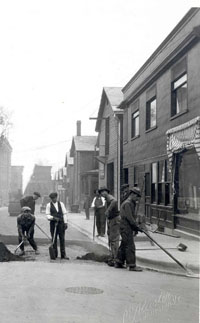 Paving Center Street in the early 1930s. 13-15 Center Street is the building with with the chimney on the right side of street. Photo by L.L. McAllister, courtesty of UVM Library, Special Collections.