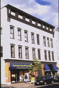The Burlington Historic Sites and Structures Survey notes that 190-194 College Street, originally Baxter's Block, with its large cornice and Italianate cast iron lintels, was built in 1859, for Carlos Baxter (1). However, in a February 19, 1868 article in the Burlington Free Press commenting on the amount of construction that occurred in Burlington during 1867, it is mentioned that "Baxter's new block of stores" was completed in 1867 at a cost of $12,000 (2). The arch top windows, the ornamental window hoods and cornice-line brackets of the then highly fashionable Italianate style also support the later 1867 construction date. Baxter was a Burlington attorney and a "collector of Internal Revenue in Burlington" (3). In the 1860s and 1870s, J.S. Pierce & Son ran a grocery store in the building; although during the 1870s, the son, A.G. Pierce, took and transformed it into a store more for agricultural tools, machinery, and seed. J.P. Middlebrook & Sons bought the store in 1905, and continued to operate it into the 1930s. Since that time, it has remained in commercial use, hosting a variety of businesses on the first floor, with apartments above. It currently houses the Vermont Color Photo Lab. Its exterior has survived the last century and a half quite well. The first floor facade has been changed and updated through the years, but the upper floors retain much of their original character.