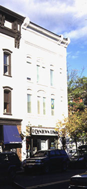 198 College Street is a fine example of a brick Italianate commercial block, with decorative cornice, and recessed arches above the windows. Built by J.P. Beach to house his bakery (4), its facade has survived well into the twenty-first century. Beach's original bakery, located west of Church Street, burned on the afternoon of April 3, 1867 (5), destroying with it part of the building owned by Catlin and Gordon that they had just finished constructing for their lumber and mill business (6). The fire is believed to have started in one of the chimneys, probably an oven chimney, as the newspaper article describing the new bakery on College Street made special note of the inch thick brick walls that encased the oven chimneys(7). Less than a year after his business was lost, he opened an arguably bigger and better establishment on College Street, just east of Church Street at a cost of $6,000 (8). He used parts of an existing building, but remodeled and added to it to the extant that it was considered then to be a new building entirely (9). He later remodeled the facade in 1885, which is what can be seen today (10). The Burlington Historic Sites and Structures Survey mentioned that A. B. Fisher may have been responsible for the building's design and construction. In 1896, Beach sold the business to the N.Y. Biscuit Co., which became the National Biscuit Co. in 1898. This later became Nabisco, who operated it until the 1920s. Though they did not use it after the 1920s, Nabisco continued to own the building until 1940s (11). Since that time, it has been modified to house a variety of business on the first floor, with apartments and offices above. It currently is the home of Downtown Discs, a music store.