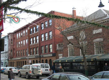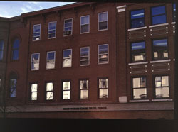 While neither of the above buildings were built during the 1853 to 1869 period under study, it is helpful to establish their history in order to clarify the history of the neighboring structures. Additionally, my research revealed discrepancies with the Burlington Historic Sites and Structures Survey, which can be corrected here. These two portions of the Burlington Free Press offices are the oldest structures, hidden behind a c. 1925 facade with a 1970s first floor alteration. The right-hand portion began as a Federal three-story gable-roofed structure with parapeted roof, built prior to 1833. In 1905 the a fourth story was added, bringing it up to the height of the original Free Press building, constructed in 1833. The original Free Press building is the left-hand section of the buildings above. A photograph from the1880s shows that it had been given an Italianate facade (1). In 1925, a new facade was constructed across these two structures, uniting them visually (2). This is contrary to the Burlington Historic Sites and Structures Survey, but in line with the research of David Blow , and with of a photograph of the block from the 1880s (3). It also concurs with an article reviewing the history of the Burlington Free Press published in 1948 (4). The Survey seems to confuse this portion of the Free Press Building with the section immediately to the east, which is documented to have been originally built as the Blodgette Oven Company (see section below), and has been the subject of later facade alterations. The section the Survey refers to as the original c. 1833 Free Press building would not have had Italianate features that early and indeed what could be seen in 1977 when the Survey was conducted did not have brackets, but rather the 1925 facade.