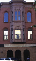 The most interesting portion of this block in terms of the 1853-1869 research period is this narrow section. The Historic Sites and Structures Survey dates the building to c. 1877, probably based on the Italianate detailing, but expressed some hesitation at this date. They thought the facade dated to about 1910, calling it a colonial revival style (8). David Blow states that it was built "probably in 1877"(9). However, newspaper articles from 1869 clearly pin the date of construction to 1869 (10, 11). The articles describe the "swell front" exterior and the interior fitted with marble tables for meats and dairy products, and fine woodwork of ash and chestnut. The rear of the building served as offices while the second and third stories were apartments and tenant rooms respectively, each with water closets and coal bins. The three stories of the new Weston building were purposely scaled to match the four-story height of the neighboring Blodgett building (11). Designed by E.C. Ryer, Mr. Weston is said to have assisted with the plans. The 1869 Sanborn map includes the footprint, marking it as "Not finished for Market & Offices." After Mr. Weston, the Jones Brothers operated a meat and grocery market on the ground floor of the building from 1878 to 1905. Standard Coal and Ice Company moved in after that, followed by McCaulliff's paper in 1914. The Burlington Free Press soon after acquired the space and has remained there since (12).