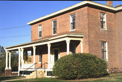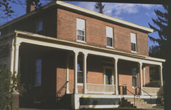 Currently owned by the University of Vermont and occupied by the Philosophy Department, this Federal with Greek Revival influences, load-bearing brick, hip-roofed building is known as the A.G. Strong residence. According to the Burlington Historic Sites and Structures Survey (1), more of the building's classical elements remain in the interior than on the exterior. Its roof may have once sported a cupola, as evidenced in the 1877 Birdseye View of Burlington Map. At least one of the building's side wings was added around 1900. A Greek Revival porch spans the width of the front and part of the north facade, but otherwise the house maintains a clean, sharp look.