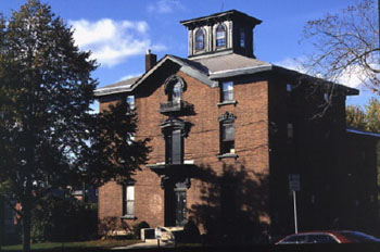 Now owned by Champlain College and operated as a dorm (Sanders Hall), this 1865 Italianate house built for Bennett Turk is thought to have been designed and constructed by the Roby Brothers (1). It does not appear on the 1853 Presdee and Edwards map of Burlington, but is marked on the 1869 Beers Atlas map. A fine example of an Italianate house in Burlington, it has round arch windows with carved floral motif head lintels and equally ornamental cast iron door surrounds. The main block of this three-story house is roughly square, brick, with three bays across the front facade, and capped with a hipped roof with cupola.