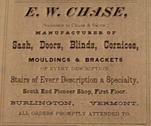 These changes are reflected in an article in the Burlington Free Press of August 21, 1878 that describes the purchase of all of the machinery used by E.W. Chase in his manufacture of doors, sash, etc., and will continue the business in all its branches. H. Eugene Sibley is mentioned as remaining with the company as a salesman. In 1894 he resigns his position due to health and goes into business dealing in lubricating oils and grease.[6]