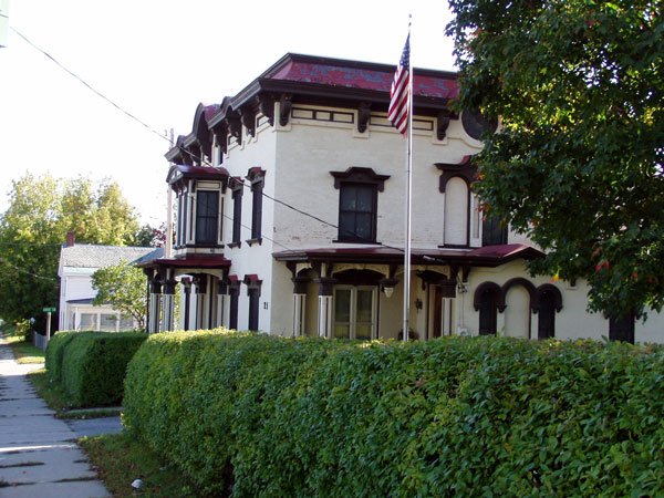 21 Chase Street is a brick two-and-a-half story square block with a one-story west wing. Its massing and features are typical of the French Second Empire style. The current structure was built on the site of a previous building that was built for the industrialist Edwin W. Chase[1] A comparison of the 1869 Beers map of Burlington and the 1890 C. M. Hopkins Map clearly show a completely different footprint on the same location. The 1877 Birds Eye View map of Burlington shows a square block building with features resembling the current structure indicating that the current building was likely built between 1869 and 1877.