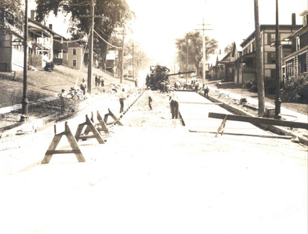 12. COLCHESTER AVENUE AT BARRETT STREET (no date) Although there is no date on this print, it seems to have been taken in either late summer or very early autumn, 1929. The Burlington Street Department evidently began the road improvement project for this section of Colchester Avenue at the bottom of the hill and worked upwards towards Chase Street. The back of a cement mixer is visible in the middle ground of the image. One part of the work crew appears to be leveling a slab in one of the three parallel sections that run the length of the street, while another group prepares the middle section. New concrete curbs have already been finished on both sides of the street, but gutters have not yet been installed between the curb and the concrete paving. Rolls of the steel rod reinforcing mats lie on the side of the road in the left foreground. A group of bystanders observe the progress of the road work. Members of the road crew are wearing overalls, white shirts and hats. Modest houses and tenement buildings line both sides of the avenue. On the east side (left side of the print), ascending up the hill, the facades and front porches of 465-467, 463, 459, 457 and 449-451 Colchester Avenue are visible. In 1929, American Woolen Company employees lived at four of these seven addresses;[1] they likely rented one floor of the double-decker wood frame structures. On the opposite side of the street, beginning at the bottom of the hill, William E. Bousquet, a bricklayer, lived at number 462, a four-square house built between 1912 and 1919.[2] Next is a large, well-maintained tenement house at number 454-456, erected between 1906 and 1912. In 1929 it was owned by Mrs. Louise LaMarche and rented out to four families. The façade of 452 Colchester Avenue, is partially visible behind the tenement house. This structure housed the Clipper Hose Company, Number 6, one of four Fire Department companies in Burlington, from 1873-1890.[3] At 448-450 Colchester Avenue is another tenement structure, occupied by the families of Clyde Weston and Leo L. Lavigne, both employed by the American Woolen Company.[4] [1] Burlington City Directory (1929). [2] Sanborn Insurance Maps (1912, 1919). [3] Philip L. Barlow, “Burlington 1877: 452 Colchester Avenue.” (2003) http://www. uvm.edu/%7Ehp206/2003-1877/pbarlow / 1877/452%20colchester.html (November 7, 2005). [4] City Directory (1929). |