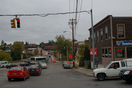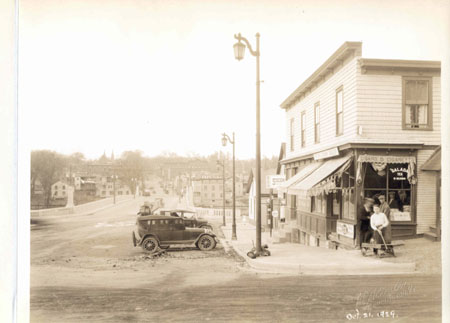 15. CORNER OF COLCHESTER AVENUE AND BARRETT STREET October 21, 1929 Photographed after the last image, on October 21, 1929, this shot looks northward from the corner of Colchester Avenue and Barrett Street across the newly constructed Winooski Bridge. It clearly shows the work in progress by the Burlington Street Department. New streetlamps, gutters and curbs have been installed, but the roadway up to the bridge abutments has not yet been paved. The people at the corner of the street captured by this photograph, a boy holding a cart by its handle, two men in wool caps behind him and another man, visible behind them and behind the plate glass window of the store at 487 Colchester Avenue, create a poignant image for the Wall Street Stock Market would crash just a week later, on October 29, 1929. This commercial block, an addition to the tenement block at 6-10 Barrett Street, was built in 1924. By comparing this image with the previous one, it is evident that new concrete steps have been built at the entrance to the second shop in this block, while the stairs into grocery store on the corner have not yet been built. A sign, lettering on the valances of the retractable canvas awnings above the windows, and lettering on the plate glass advertise the multipurpose nature of this shop: vegetables and groceries, ice cream parlor, cigars and cigarettes, Coca-Cola, and Salada Tea. This was the general store and likely a meeting place for the local working class community. Just beyond this block, attached to the garage at 491 Colchester Avenue, a new sign for Socony gasoline is visible. Street car tracks and electric lines have just recently been removed from the roadway here, after the service was terminated in July 1929.[1] This is the advent of the automobile age in the city of Burlington. [1] Robert B. Michaud, Salute to Burlington: An Informal History of Burlington, Vermont (Lyndonville: Lyndon State College, 1991), 133. |