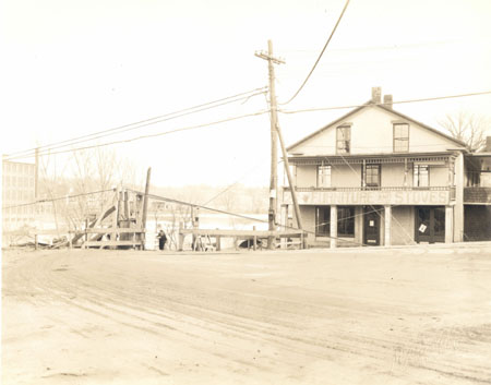 26. 495 COLCHESTER AVENUE (no date) This photograph of 495 Colchester Avenue looking east with a view of the Winooski River and the riverbank beyond it was likely shot at the same time as images 11 and 14. Since the new bridge abutments visible in image 15 are not yet in place here, it certainly was taken before August 1928 when the bridge was opened. This would seem to date the image to the winter or spring of 1928, fewer than six months after the flood of November 1927. According to Visser, the commercial structure at 495 Colchester Avenue was built between 1841 and 1846 and from that time it served as a store, a blacksmith and wheelwright shop, then a second hand thrift store and again as a grocery store in 1912.[1] When McAlister took this image it most recently had been used to sell furniture and stoves, as evidenced by the large sign affixed to the railing of the second story porch. The ground floor of the building, while not boarded up, appears to be vacant. The City Directory in 1929 lists Sarkis Boyakian, a laborer, as the only tenant at this address.[2] The building, sometimes called the Duncan-Dubuc Blacksmith Shop,[3] is a three story, three-by-five bay brick structure with the gable end facing Colchester Avenue. It has a shallow pitched roof with wide cornice returns. A central entry is flanked by shop windows and a double door on the ground floor. Three two-over-two sash windows are spaced regularly on the second story. The lintels of the two windows on the third floor are partially covered by the frieze moulding of the gable end. The two story porch is supported by four square columns below and five turned posts rising from the railing above. Delicate spindles form a narrow band under the porch’s flat roof. Utility poles and lines and an electric line for streetcars are visible in the foreground. A temporary wood fence blocks vehicles access to Mill Street, which begins just to the left of the commercial building. Perhaps work to clear the damage wrought by the flood was still taking place. [1]Thomas D. Visser, “Winooski Falls Historic District, Proposed Boundary Increase, Amendment to National Register Nomination” (1986). [2] Burlington City Directory (1929). [3] David J. Blow, Historic Guide to Burlington Neighborhoods, Vol. 2 (Burlington: Chittenden County Historical Society, 1997), 102.