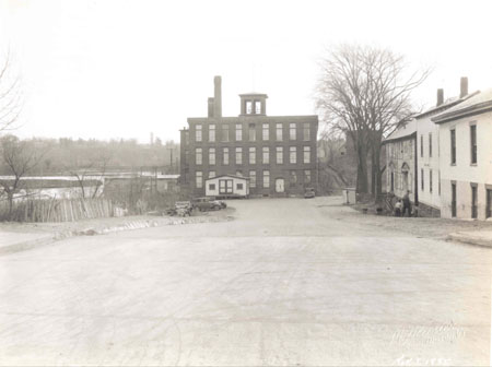 27. MILL STREET FROM COLCHESTER AVENUE November 1, 1935 This image shows the length of Mill Street from Colchester Avenue, looking east to its end at the mill, owned at the time the photograph was taken by the American Woolen Company. The streetscape is quite bleak. Aside from two men who appear to be passersby entering an alley between two of the tenement buildings, there is no activity going on here. The Winooski River at the Upper Falls is visible on the left side of the image. There is a ramshackle stockade fence along part of the riverbank. Two or three automobiles are parked near the mill building. Three tenement houses, at 495 Colchester Avenue, 5-7 Mill Street and 13-19 Mill Street are closely aligned on the right. The brick masonry building at 495 Colchester Avenue (photographed from the front in image 26) is partially visible in the foreground. Both 5-7 and 13-19 Mill Street are two-story, multiple-bayed wood structures. The American Woolen Company’s mill is nine bays wide and three stories high. A ground level wood door is located in the third bay on the left. A small wood outbuilding that appears to be a storage shed blocks a full view of the mill’s façade. The fenestration consists of large windows with granite sills: nine-over-nine sashes below with six paned transom lights above, to allow as much natural light as possible into the interior work area. The flat roof has an articulated cornice all around. A hip-roofed open bell tower sits atop the roof at the center of the facade . There are two tall smokestacks, and a three story ell is partially visible on the north side. The site of this mill has great historical significance for the city of Burlington. As Thomas Visser wrote in 1986 in a proposal to extend the boundaries of the Winooski Falls National Register District: " Within several years of the first permanent settlement at Winooski Falls, Ira Allen, a founder of Vermont and major land-holder in the region, constructed a dam across the Winooski (Onion) River at the upper falls and built sawmills on both ends. These provided lumber for local construction as well as for export to Lower Canada and England. Ira, with his brothers Ethan, the Revolutionary War hero, and Levi, a merchant operating from Saint John’s, Lower Canada, started the Onion River Company, with a store located at the falls, which was the head of navigation from Lake Champlain. They also had the first road… constructed to the falls, crossing there by ferry and then a bridge. Onion River Falls, as it was then known, was the major commercial center in Northern Vermont."[1] During the nineteenth century, a series of mills, first for lumber and grain and then for textiles beginning in the 1840’s, were built on both sides of the river near the falls. The mill in the McAllister image was constructed in 1892 by the Burlington Cotton Company.[2] The American Woolen Company of Fall River, Massachusetts bought the Stock of the Burlington Company for $240,000 in 1906.[3] The mill closed its doors in the late 1920’s, but opened again to produce khaki for the United States Army during World War II.[4] [1] Thomas D. Visser, “Winooski Falls Historic District, Proposed Boundary Increase, Amendment to National Register Nomination” (1986). [2] Visser, “Winooski Falls Historic District.” [3] David J. Blow, Historic Guide to Burlington Neighborhoods, Vol. 2 (Burlington: Chittenden County Historical Society, 1997), 105. [4] Ralph Nading Hill,The Winooski: Heartway of Vermont (New York: Rinehart and Company, 1949), 256. |