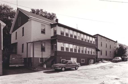 In the 1986 photograph, taken by Thomas Visser, it appears that the tenement building at 13-19 Mill Street has been recently renovated. It is clad in metal siding, with a brick veneer along the foundation wall. A narrow, two-story enclosed porch has covered all but two of the front bays. A rudimentary shed roof supported by two plain posts covers the raised entry at the corner of the new porch. Metal storm windows have been installed all around. The structure to the right, at 5-7 Mill Street, remains very similar to its appearance in 1935. Four small openings, likely for ventilation, have been cut into the façade above the second-story level. |