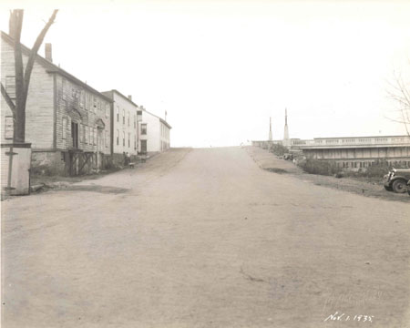 28. MILL STREET FROM THE AMERICAN WOOLEN COMPANY November 1, 1935 An abutment of the new Winooski Bridge, completed in 1928, a year after the disastrous flooding of the Winooski River, is visible on the right of this image dated November 1, 1935. Two ornamental obelisks mark the end of the bridge, where open-work concrete railings begin on both sides. Mill Street has been recently paved with asphalt by the Burlington Street Department. The dilapidated condition of the tenement in the foreground, however, belies the fact that the mills around Winooski Falls are in decline and the economy is in a severe recession. The 1935 City Directory lists the properties at 5-7 and 13-19 Mill Street as vacant.[1] The American Woolen Company Mill had been closed for several years by the time this photograph was taken by Louis L. McAllister. The large scale of the structures can be discerned by comparison with the two men with shovels and a wheelbarrow at work in front of 5-7 Mill Street. The tenement’s windows at 13-19 Mill Street are boarded up. Stairs leading up to the two doorways on the first floor level have been removed. Above the door lintels are marks on the clapboards where gable pediments, likely supported by small raised porches, have also been removed. Yet the building retains a solemn dignity, as part of the ensemble of these three large tenements that were the first homes of so many immigrants to Burlington. [1] Burlington City Directory (1935). |