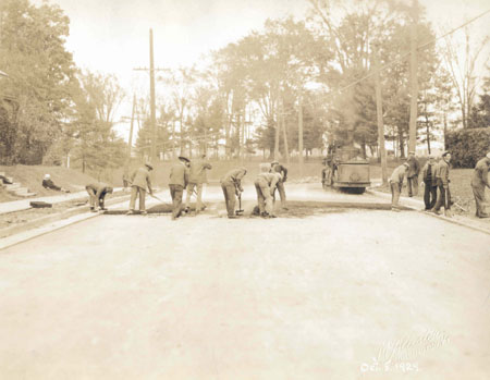 5. STREET DEPARTMENT CREW AND STEAM ROLLER AT ENTRANCE TO GREEN MOUNT CEMETERY October 8, 1929 A dozen street department employees, wearing canvas jackets, trousers and caps, are at work spreading asphalt while a steamroller approaches to flatten and smooth the layer. An observer is sitting on a lawn near a set of steps next to a newly installed sidewalk. This image was published in the Burlington Annual Report for 1929 with a caption describing the concrete base in the foreground “with two-inch shoulders at gutters… the asphalt gang is at work laying new two-inch ‘Stone-Filled-Sheet-Asphalt’-wearing surface on concrete base.”[1] On the opposite side of Colchester Avenue is the entrance to Green Mount Cemetery, one of the first European burial grounds in the city. The oldest grave dates to 1775. [2] Ethan Allen was buried here in 1789. The Vermont legislature commissioned a memorial statue in 1858 but work was not completed until 1873 when a granite column with a statue of Allen atop it was unveiled.[ 3] Mary Fletcher is also buried here. The viewpoint of the photograph looks east. Just beyond the horizon the steep hill descends down to the Winooski River. [1] Annual Report of the City of Burlington (1929), 236. [2] Arthur L. And Frances P. Hyde, Burial Grounds of Vermont (Bradford: Vermont Old Cemetery Association, 1991), 48. [3] Peter S. Jennison, Roadside History of Vermont (Missoula: Mountain Press Publishing Company, 1989), 63.