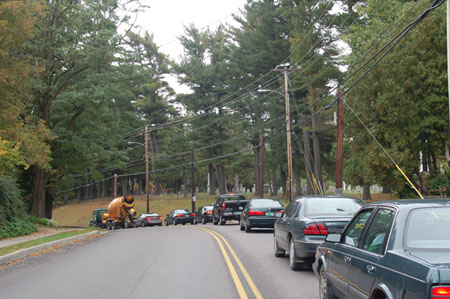 5. COLCHESTER AVENUE AT ENTRANCE TO GREEN MOUNT CEMETERY October 11, 2005 (18T 0644043 UTM 4927230) Utility poles are visible in this image, as they are in the McAllister photograph, but with streetlights and many more lines strung along them. The cemetery entrance remains in the same location today; here it is hidden behind the line of automobiles. Notice that the deciduous trees in the 1929 image are gone now, but the small pines behind them have grown into tall, mature trees. |