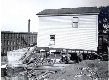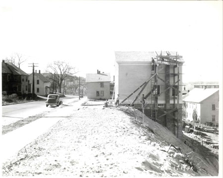 Finally, on October 17, 1941, the house had been lifted ten feet and moved fifteen feet back from the road. A new chimney is being built by workmen on wood scaffolding and ladders. The steep grade of the hill is clearly visible in this image of the east elevation. The concrete foundation was clad with cement blocks and is nearly as tall as the two-story building. The new sidewalk and asphalt paving along Barrett Street have also been finished. According to the caption, more than three thousand cubic yards of earth fill was placed between the street and the building’s new location.