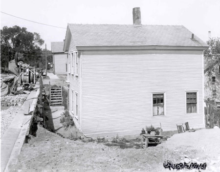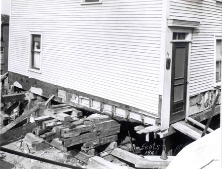 21., 22., 23. & 24. MOVING 32 BARRETT STREET August to October 1941 This series of four images illustrate the process of lifting and moving the house at 32 Barrett Street up and back from the street. The versos of the McAllister prints contain typed captions outlining the move. Thus the first image, dated August 4, 1941, showing the east elevation of the house, describes conditions before work began: "Note the new integral curbing and gutter just constructed on the top of the old stone retaining wall about ten feet in front of the house; also the old wooden stairs necessary to descent in order to enter the ground floor of the house which is approximately ten feet below the surface of the street; also note condition of the old chimney which was later rebuilt on the outside of the house."