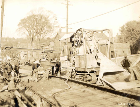 In his memoir Salute to Burlington, Robert A. Michaud recalls observing the road crew at work along Winooski Avenue in 1929 when he was a boy: "My comrades and I enjoyed watching this labor intensive project… The men shoveled sand and bagged cement into a hopper that was hoisted into the jaws of the mixer compartment of a large machine. The mixing cylinder rotated noisily until the concrete was ready to pour. The contents were emptied into a gondola that carried the concrete along a long suspended rail to the desired drop area in the form to be filled. The poured concrete was then leveled by brawny, barebacked laborers by hand shovel. Prior to the concrete ‘setting up,’ the wet concrete was finish-troweled within the frame to get the correct slope. After this operation, the concrete was covered with a large canvas tarpaulin, and for several days water was applied to aid in the curing process."[2]