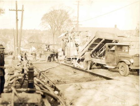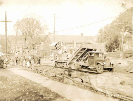 7., 8., & 9. COLCHESTER AVENUE AT CHASE STREET WITH ROAD CONSTRUCTION EQUIPMENT October 19, 1929 A series of three images show the progress of the roadwork along Colchester Avenue during the fall of 1929. Because of the steep grade of the hill in this area, the Burlington Street Department made the decision to pave the roadway with concrete. The three photographs illustrate the process of pouring one of the three concrete slabs. After the street grade was lowered and leveled, steel rod reinforcing mats were rolled atop it and secured with iron rails. Joints were placed at intervals of forty-four feet, which was the length of the slabs.[1] Finally, concrete was poured into the forms.