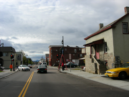 Lucy Pittman October 18th, 2005 In the current image 204 North Street stands tall. Some other buildings around the intersection have been lost. Yet 204 North Street perserveres with modest changes. The Paramount Cut Rate Shoppe no longer inhabits the building. Today it is the Diamond Taxi Service, as the yellow cab indicates. The basement level has been clad in a stone veneer. The staircase has been rebuilt with wooden rails and cement steps. The irregular plan of the building remains and is characteristic of North Street 1 . Many streets cross North Street creating sharp angles at most of the intersections, in turn the footprints of corner buildings are shaped by the roads. |