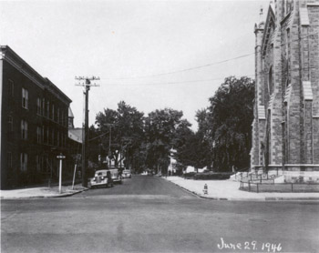 84 Cherry Street Taken at the intersection of Cherry Street and St. Paul Street looking west down Cherry Street, this McAllister photograph depicts how the west half of downtown Burlington looked in 1946. Bordering the downtown business district and adjacent residential area to the west, this area is a transition zone between commercial and residential uses. The more residential areas are characterized by large overstory deciduous trees seen in the background of the photograph, while the more commercial areas have limited or no trees like in the foreground. Cherry Street is narrower than other adjacent streets, with two through lanes and on-street parking along the south side of the street. Three cars are parked along the cut stone curb to the south side of the street. The street corners are characterized by a utility pole that supports overhead utility lines, a street sign, and a fire hydrant. To the south (left) is a brick building, 35 St. Paul Street, and along the north (right) side of the street is the Cathedral of Immaculate Conception, 97 Cherry Street. The Cathedral has a low iron railing surrounding the lawn area in the foreground, while a low hedge marks the property to the west in the background. The caption on the photograph reads, “This view of Cherry Street taken from the intersection of St. Paul Street shows the new stone-filled sheet asphalt hot plant mix pavement in front of the Cathedral Church only a few days after its completion. This pavement was constructed approximately two inches in thickness over the old pavement as a base. The gutters were first built up to maintain a uniform depth of six inch curb face.” 35 ST. PAUL STREET The building at 35 St. Paul Street is a three story, five bay wood frame building with a brick veneer. The building first appears on the 1853 map of Burlington, indicating it was constructed during the mid 19th century(1). By 1869, J.W. Carpenter owned the property, and after the turn of the century in 1901, the building remained occupied by a single tenant—W.N. Perry(2). However, by 1931, the building was subdivided into apartments and offices. Tenants included Yvonne N Turk, physician, David Manson, dentist, Harry T. Bason, Leonard Johonnott, and Irene Wadsworth(3). One apartment was also listed as vacant at the time. In 1942, the building continued to house a number of occupants including Erald F. Foster, physician, David Manson, dentist, Thomas O’Halloran, Mrs. Edyth D. Bushnell, Leonard Johonnott, and Raymond McKenzie(4). 97 CHERRY STREET The Cathedral of the Immaculate Conception is a Gothic Revival church constructed of local materials including marble and slate from the Rutland area, limestone from Isle of la Motte, and redstone from the local Burlington area(5). Sited on the location of the former St. Mary’s Church that was constructed in 1841, the Cathedral was built to replace the St. Mary’s Chruch and accommodate the growing Catholic and immigrant population in Burlington during the late 1860s(6). The building was designed and constructed by Patrick Keeley from Brooklyn beginning in the early 1860s(7). The design called for two separate part of the church—the Cathedral to Immaculate Conception and a smaller chapel to St. Patrick. While the cornerstone for the foundation of the chapel was set on June 10, 1862, the cornerstone for the Cathedral wasn’t set until one year later during the summer of 1863(8). After a lengthy construction process, the Cathedral opened for worship on May 18, 1867, and was consecrated almost six months later on December 8, 1867 as the “first church in the northeast designed, created, and dedicated as a Cathedral Church.”(9) Though the building was opened and utilized by parishioners, the bell tower was not yet completed. Nevertheless, the original bell from the 1841 St. Mary’s Church was placed in the unfinished bell tower while construction on the tower progressed(10). In 1899 the original bell cracked and was replaced with a new bell weighing 4500 pounds one year later(11). In 1904, construction of the bell tower was completed, and the tower was opened(12). Little was done to the church between the early 1900s and 1940s, with the exception of resetting the alter in 1936 after vibrations from adjacent traffic on St. Paul and Cherry Streets caused the alter to sink(13). Back to Depression Era Streetscapes.