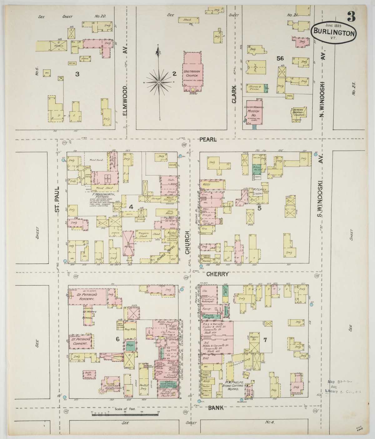 26. Sanborn Map Company, Burlington 1900, Sheet 17. [map]. New York: Sanborn Map Company, Accessed November 3, 2017, Special Collections, University of Vermont, http://cdi.uvm.edu/collections/item/btvfi_1900_017.
