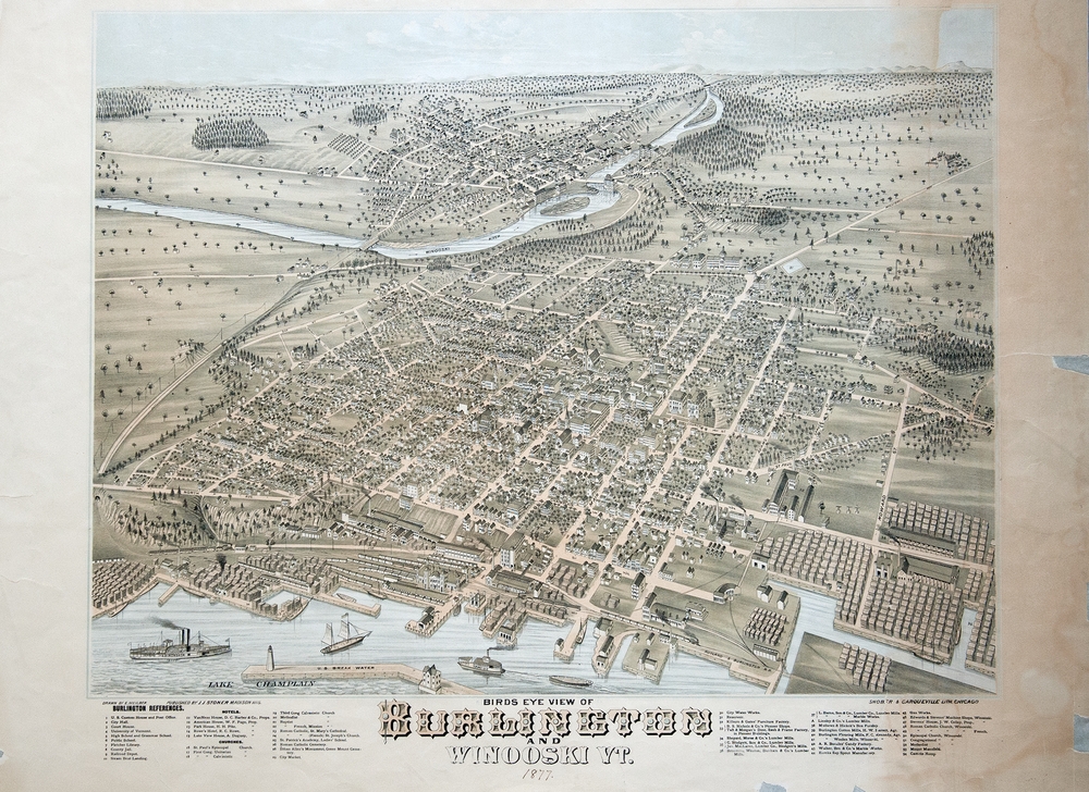 3. J. J. Stoner, Birds eye view of Burlington and Winooski VT. [map] Accessed through Special Collections, University of Vermont Library, October 5, 2017, http://cdi.uvm.edu/collections/item/Burlington_Map-1877birdseye.