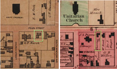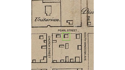 The current building’s origins are obscure. The earliest evidence of a structure on this site is depicted in Ammi B. Young’s 1830 map of Burlington. Roughly situated in the center of the block a square structure slightly setback from Pearl Street is clearly depicted.16 Presdee & Edwards 1853 map of Burlington shows a similarly setback structure with a new addition opposite the façade.17 A map produced sixteen years later shows a building with a similar footprint as seen in the F.W. Beers map of Burlington.18