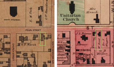 An outstanding view of George. P. Marsh’s home at the corner of Church and Pearl Street can be seen in the 1860 panorama photograph from the Unitarian Church seen in Figure 2. Note the condition of the house with peeling paint on the north elevation (Pearl Street side), missing shutters on second floor, and new fence construction around property.