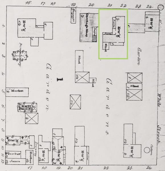 The property quickly sold to Dr. William Root and the transaction and new structure is noted in the 1869 F.W. Beers map and Sanborn map of the same year.38 The Sanborn map provides an amazingly clear footprint of the two-story, L-shaped structure still standing today.39