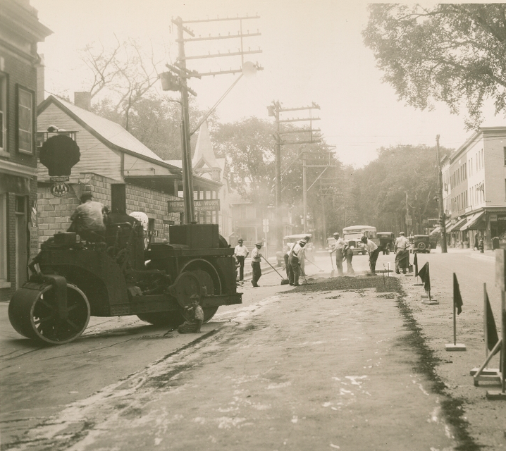 The dramatic changes are seen in the following photos. The first photograph, taken by local professional photographer Louis McAllister in the summer of 1934 shows a road paving crew working in front of the properties discussed.49 The second photograph taken in the late 1960’s shows the service station.50 Though taken at a different angle, the open sight lines spoken of in the Burlington Free Press article are clearly seen. Note in the latter photograph the opposite corner lot is occupied by a Gulf Service Station, a busy intersection indeed.