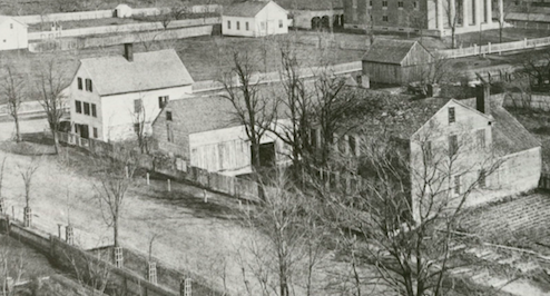Here stood a westerly facing two-story, five-by-two bay domestic building with gambrel roof and small porch sheltering the main entrance. An addition extends from the back elevation. The entire structure is offset from both Church and Pearl Streets. Included on this property was a standalone brick building seen just beyond the main structure. This property is clearly detailed in the 1860 panorama photograph (Figure 2.)7