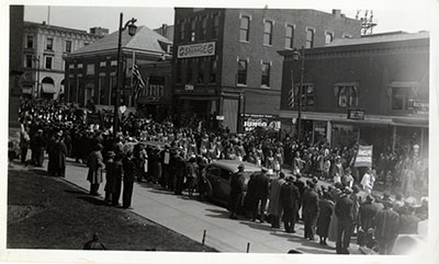 This reconstruction was necessitated by a fire in 1900 that destroyed the building.33 Named the Hyland Block, the new structure occupied the same footprint but on a grander scale (Fig. 14). As it currently stands, the historic character of what was originally a three-story, four-by-six bay, loadbearing masonry commercial block has been obscured by multiple alterations (see Fig. 13). The original commercial block featured a wooden cornice facing Church Street and one over one double-hung sash windows on each facade, which were arched on the third story of the west façade and flat-topped elsewhere. They had granite impost blocks flanking brick lintels; granite was also used for the sills and a tablet centered beneath the cornice engraved with “HYLAND.” Most of these elements are legible in a circa 1941 photograph of a parade on Church Street and are confirmed by a less-detailed postcard from the 1900s (Figs. 14 & 9). While it remained in its original form, the Church Street façade was also decorated with striped awnings and business signs for F. Howes & Co., which sold meat there for almost half a century, as well as various upstairs tenants. In the first two decades of the 20th century, the upper floors were rented by Company M of the Vermont National Guard, followed by Bethel Lodge, No. 22, Knights of Pythias.34 The second floor briefly housed a suspender factory in the 1910s and the Burlington Production Credit Association rented space during the 1930s and 1940s.35