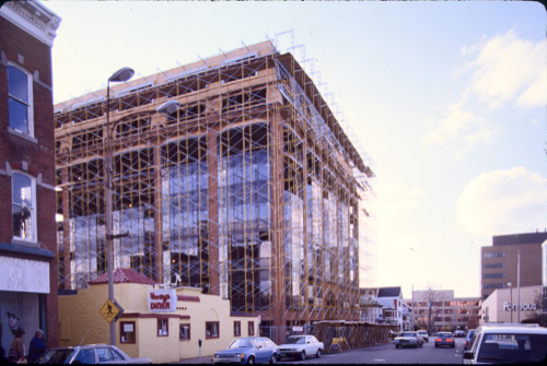 In February of 1978, a large fire started in the Burlington Paint & Tile Company in the area; as it grew, it destroyed a total of eight structures surrounding this intersection including this one. This is the reason why there are new constructions concentrated here. The building that occupies this northern corner today is reminiscent of the structure which preceded it; however, the overall structure is a disappointment, as it only attempted to mimic the original’s form. The new structure is made out of metal with shiny finishes and lacks the intricate and complex architectural details of the old building. The corner entrance, however, was maintained, and the space currently houses a beauty supply store.