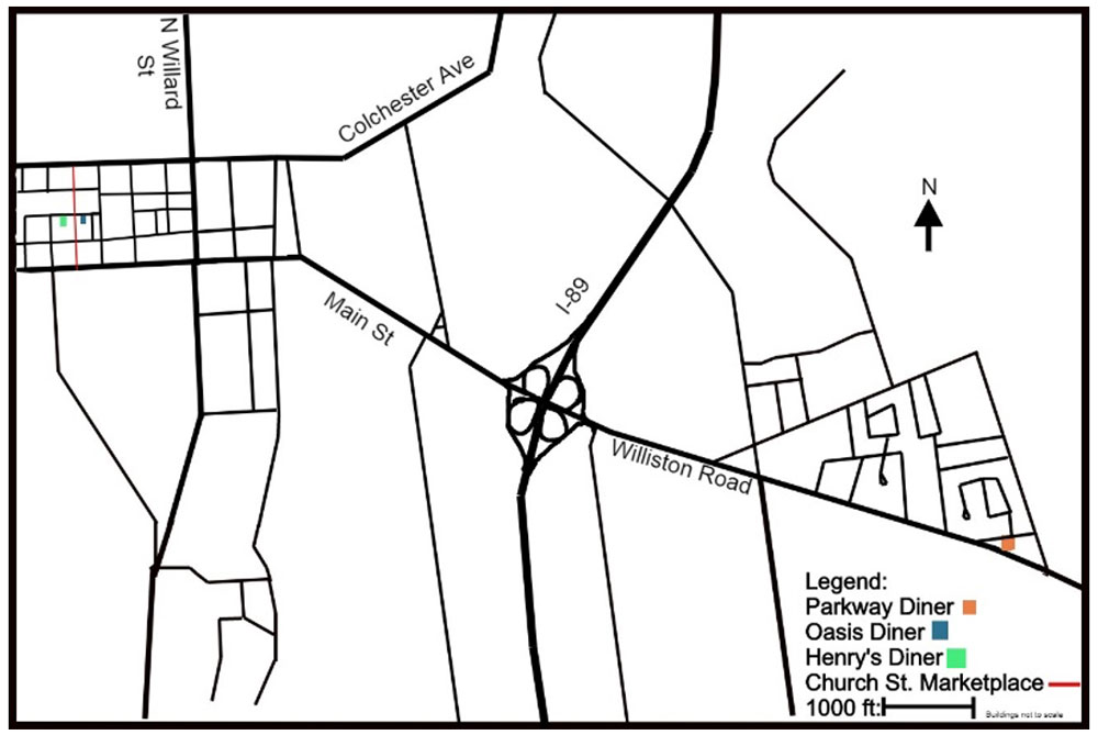 While there are many other established and iconic eateries in the area, several among them being diners, Henry’s Diner, Oasis Diner, and Parkway Diner were the best fit in regard to the scope of this research. Each started with the unmistakable design of a diner and evolved over time, letting them build their own identity despite starting in a similar style. Henry’s Diner and the former Oasis Diner are located on Bank Street in Burlington, VT, putting them within a block of the Church Street Marketplace. The third diner – Parkway Diner – is located near the intersection of Williston Road and Kennedy Drive/Airport Road. Each of these diners have unique traits that provide nourishment for those who visit, going beyond the basic goal of a diner by providing the intangible things that only a diner can offer.