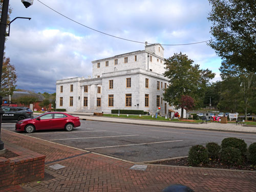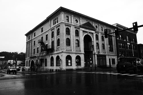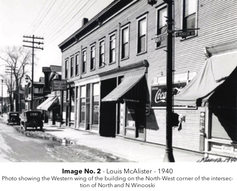 Image No. 3, a photograph taken by Louis McAllister in 1930, the North Street facade of the building is shown with awnings that have since been removed. The passage that cuts through the west wing of the structure can be seen as well, next to the person standing on the adjacent sidewalk. A sign suggests that a cafe was housed in one of the secondary storefronts during the year of 1930.