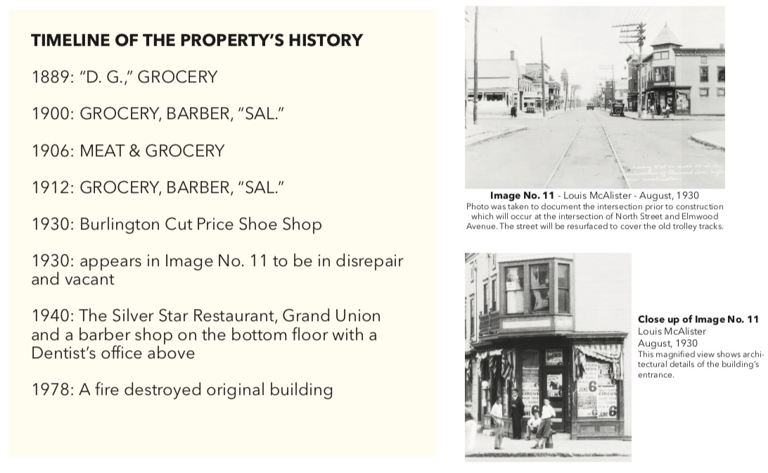 This property, on the northern corner of North Street and Elmwood Avenue, has been defined on maps of Burlington since at least 1889; it was listed as a grocery in 1889 Beers map and as a Grocery and Barber Shop in 1900 on Sanborn maps The Burlington city directory of 1930 listed the building as “Burlington Cut Price Shoe Shop,” but in Image No. 11, taken in the same year, the building appears to be vacant; this can be inferred based off of the tattered and unkempt awnings of the storefront, the abundance of flier advertisements plastered over the front windows, and the young boys sitting down in the store’s entryway. The same photo also gives us a glimpse at the southern corner of this intersection, showing Louis N. Turner’s drug store with advertisements for candy and cigars in the windows and a few doors down, Bloomberg Shoes. The brick commercial building that was occupying Turner’s Drug Store was built in 1904 for druggist Eugene Gosselin’s firm, Gosselin & Brothers who operated two drug stores in the neighborhood.