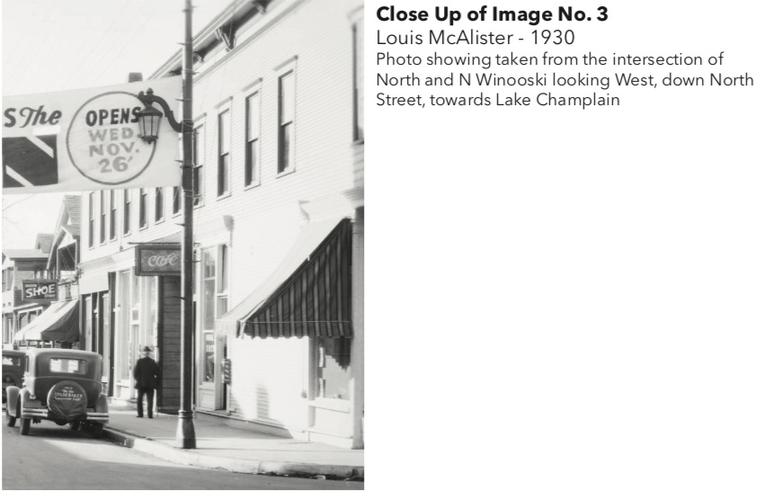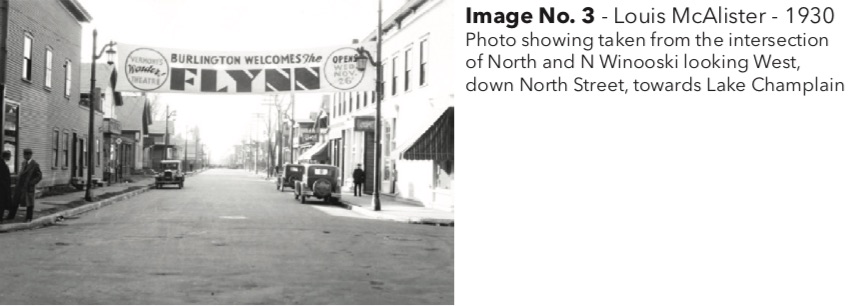 Image No. 2 was also taken by McAllister, but in 1940, a decade after the previous image. This photograph is angled so that more of the facade of the west wing can be seen. This image was taken by McAllister in order to document the new street signs put up by the Burlington Street Department. From farthest down North Street to the corner of North and North Winooski, the signs show that the store fronts along the wing were occupied in 1940 by “Kirby’s Radio Shop,” “Sottie (Sattie) Sweets” (Homemade Pastries), before the passage way, and after, “Bouchard’s Barber Shop.” Currently the building is occupied by Shinjuku Station, a sushi restaurant owned by immigrants from Japan; apartments are still located in the second floor.