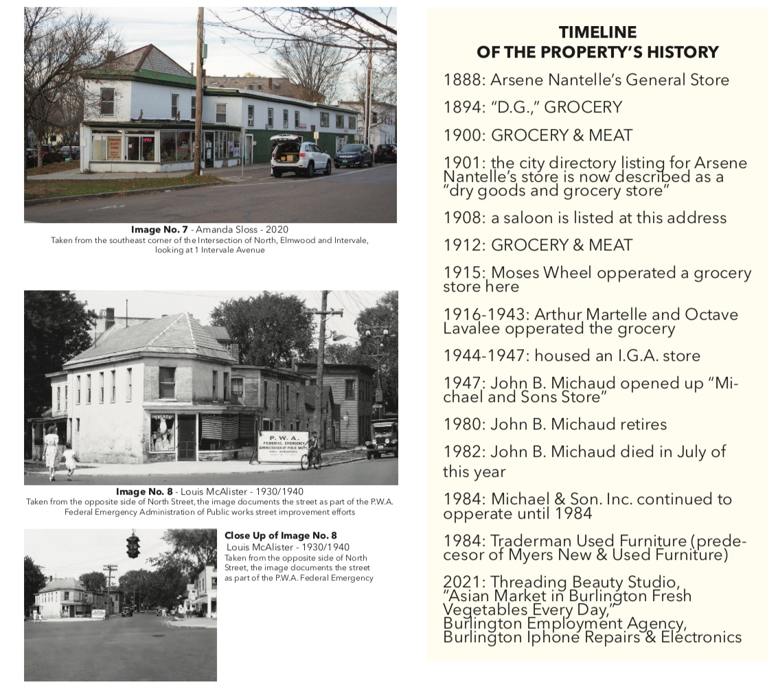 The building located on this irregularly-shaped plot of land has been listed on the Burlington city maps as far back as 1853. It was first listed in the city directory in the year 1888 as Arsene Nantelle’s General Store and was listed again as owned by Nantelle in 1901, but as a “dry goods and grocery store.” In 1900 it was listed on Sanborn maps as “Grocery & Meat,” but David J. Blow’s Historic Guide to Burlington Neighborhoods lists the building as a Saloon in the same year - owned and operated by Victor Fischer. Fischer be- came a police officer in 1911 (police station #2 was located across the street); by 1915, the Saloon was no longer in business and Moses Wheel operated a grocery store at the location. The year after, the store was taken over by Arthur Martelle and Octave Lavalee. They ran the grocery until 1943, when Harold W. Ready started managing an ”I.G.A.” store, which he did for five years. IGA stands for the Independent Grocers Alliance; founded in 1926, it aimed to bring family owned, local grocery stores together under the IGA brand.