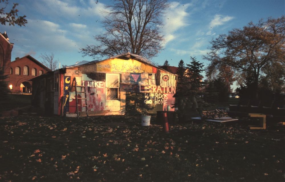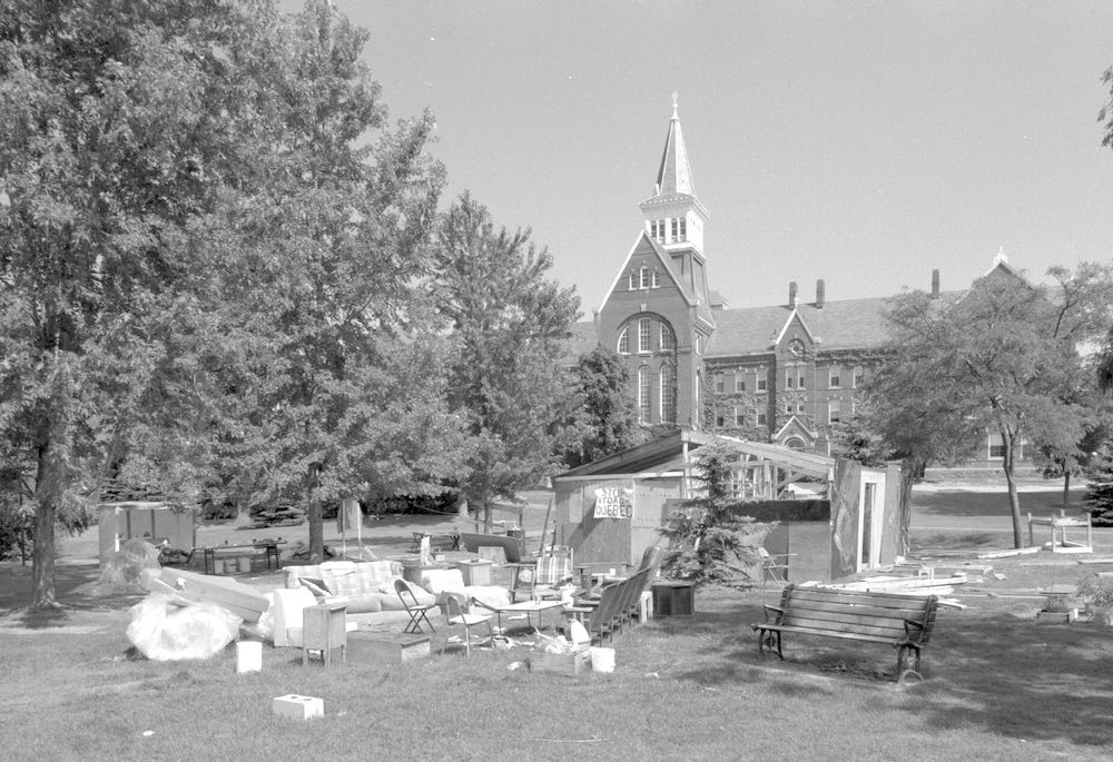 Crossroads (October 1985 - dismantled December 1985)By Robin FordhamEvery building has a lifetime. Some like the Parthenon survive centuries, while others - like the fantastic structures at Burning Man - are built with the full knowledge of their temporary nature.1 The buildings on the University of Vermont campus have risen (often with great fanfare) and fallen (sometimes with anguish, sometimes with hardly a whimper) as the needs of the University have sought alignment with shifts in educational philosophy, demographics, and technology. The protest village Crossroads comprised some of the most fleeting buildings on the University’s campus. Beginning in 1979 students at UVM joined the growing anti-Apartheid movement, urging the Board of Trustees not to invest in companies in South Africa which “supported the racist oppression and terrorism of the South African government.”2 The Board ignored the students’ recommendation, and investment in South Africa continued unabated for several years to come. By 1985, however, campus movements across the country were gaining visibility in their efforts to increase pressure on universities to divest from South Africa. While important work continued within student government associations, sit-ins, etc., the construction of campus shantytowns modeled after the poor housing communities of black South Africans provided a new protest tool in the powerful visual reminder of the political work going on at the administration level. As one student leader remarked, these makeshift structures “distrupt[ed] the campus landscape of tidy quadrangles and plazas, symbolizing the viciousness of apartheid and the oppression of South Africa’s [black population].3 Despite continued progress in the fall of 1985 between the administration and concerned students, faculty and staff to develop a divestment plan, the Board of Trustees continued to vote down resolutions which called for a swift divestment process. In response to the lack of progress, on October 12, 1985, UVM’s shantytown Crossroads was constructed by the “Apartheid Negation Congress (ANC), a group of concerned students, faculty, and staff.”4