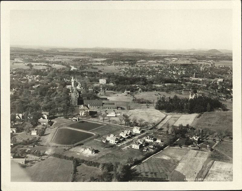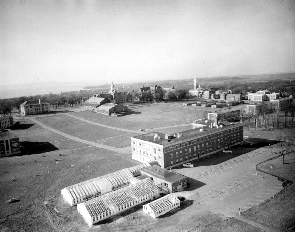Aerial view looking northwest with Main Street at left next to Morrill Hall and Carrigan Dairy Science Center. Terrill Hall is at lower left and Old Mill is at the upper right. Greenhouses are between Carrigan Dairy Science Center and the Old Gym (now Royall Tyler Theater. UVM Special Collections